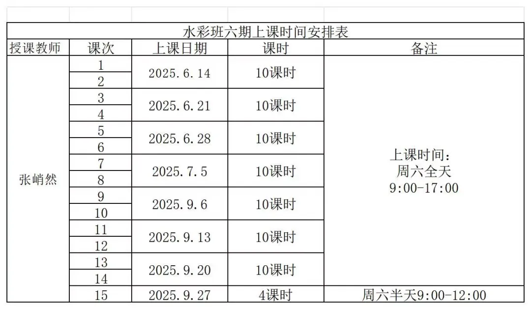 2025年6月14日起(如有更改,另行通知)。每周六全天(全天为2次课)。15次课为一个教学周期。